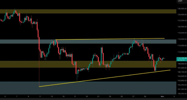현재 비트코인 시장은 무역, 금리, 온체인 요소들이 복합적으로 작용하며 방향성을 정하지 못하고 있습니다. 그러나 차트상으로는 $108K~$110K 구간이 단기 지지선으로 작용하고 있으며, 이는 장기적 저점 형성 가능성도 내포하고 있습니다.